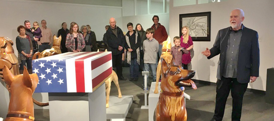 Teaching positions include Houghton College where he started the art program in 1979, head of the sculpture program at Calvin College (1989-91) and he developed the three-dimensional program and designed the facilities at Cedarville University (2008-14). In 2012-2013 he was given the Faculty Award for Scholarship, a rare honor for the fine and performing arts in academe. Mellick’s allegorical wood sculptures are collected internationally and he is in many private collections and as well as museum and academic collections. A recent nominee for the Governor’s Award in Ohio, he is recognized as a “Master Ohio Craftsman”. He has over 180 exhibitions to his credit, including 40 one and two person shows. His images are in national and international publications and three sculpture textbooks. In 2016 James Mellick’s Wounded Warrior Dogs won the international Grand Prize by Popular Vote at Art Prize 8.