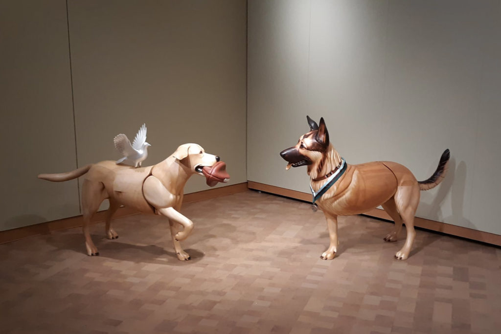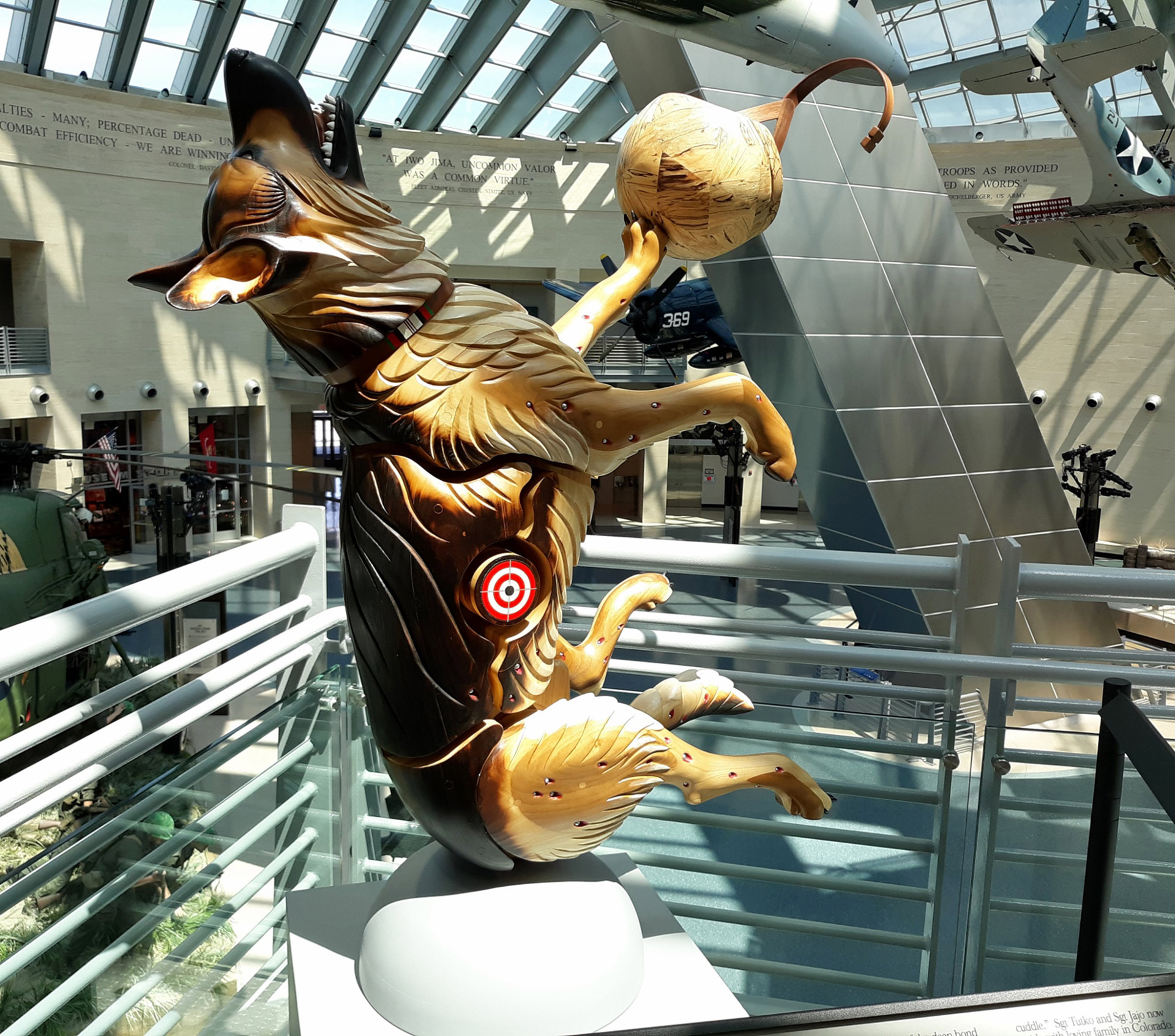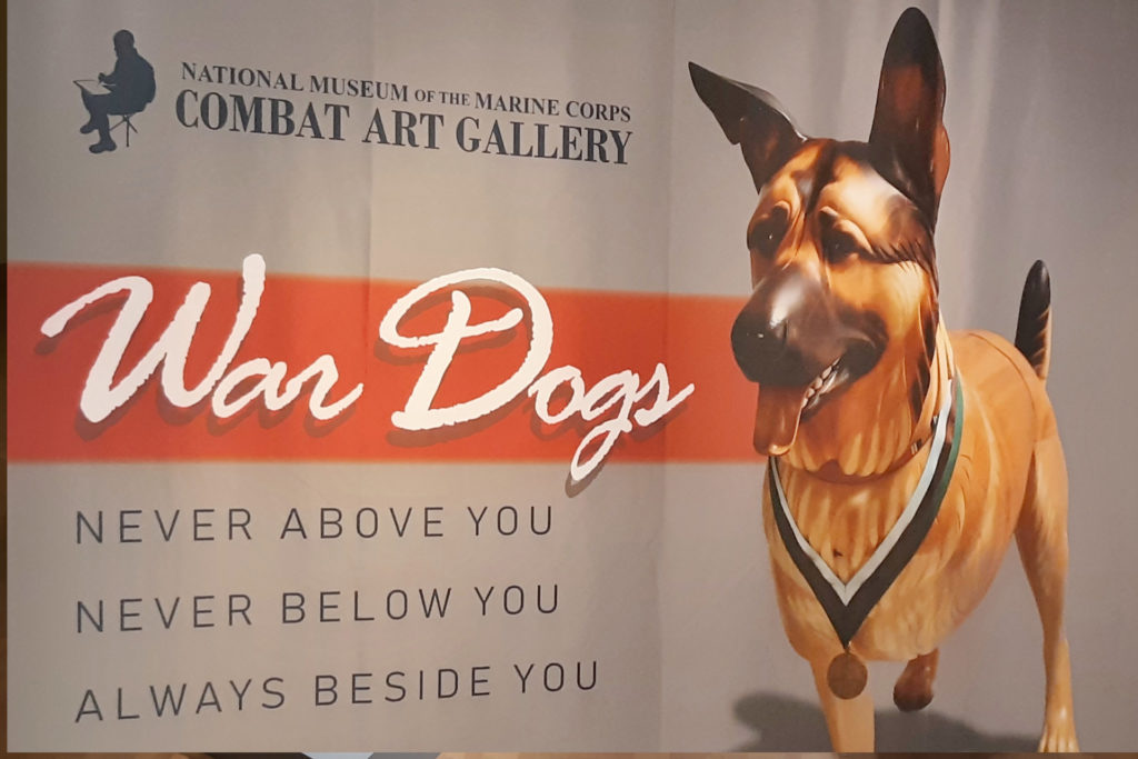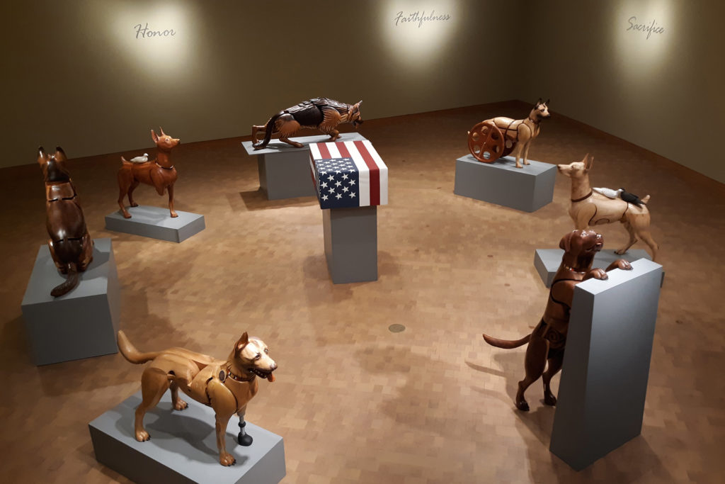 Mellick’s wood-carved dogs are symbolic of the sacrifices made by canine and human warriors alike. The 28 works of combat art by 21 artists capture military dogs at work around the globe, from the jungles of the Pacific during WWII through the wars in Iraq and Afghanistan. Artifacts that tell specific stories of Marine Corps dogs and handlers round out this tribute to war dogs.