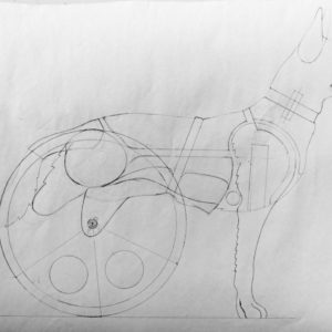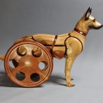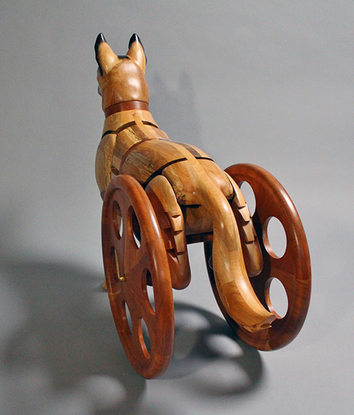 This Malinois wears the service ribbon from Afghanistan and is a double amputee aided by a sling wheelchair. The wheels are free-turning, more like those designed for wheelchairs for humans. Note the Purple Heart.