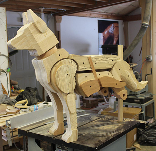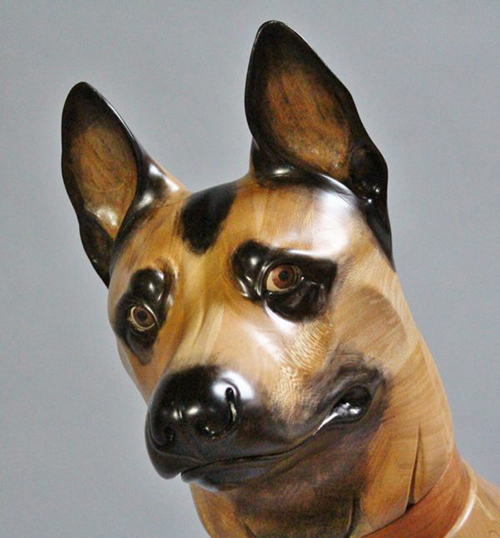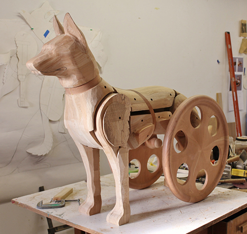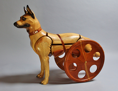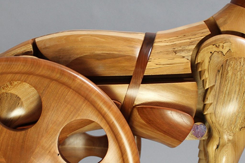 Laminated and carved sycamore and cherry, copper, and oil paint.