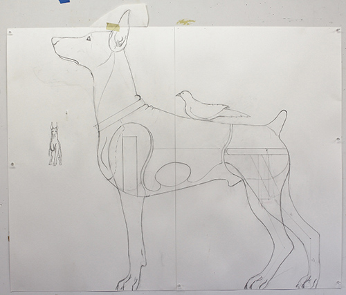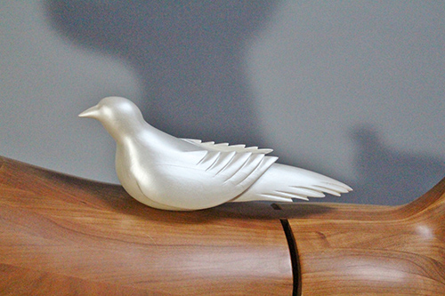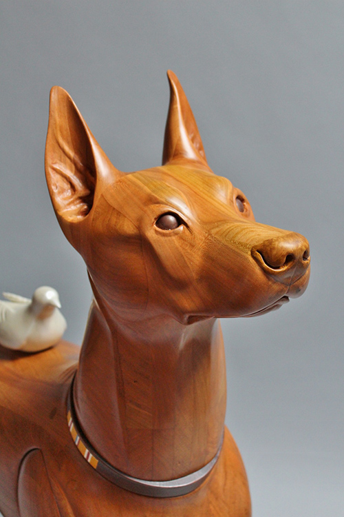 The Doberman Pinscher wears the service ribbon of the Asian-Pacific campaign of World War II. This dog represents the wounded veterans of the “Greatest Generation.” Without a prosthetic leg, this dog is at peace, accompanied by a dove, a symbol of blessing, mercy, and spiritual transformation.