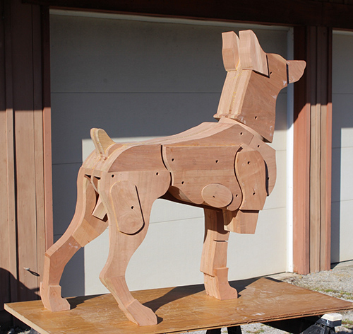 Laminated and carved cherry and basswood, copper details, and acrylic paint.