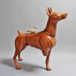 The Doberman Pinscher wears the service ribbon of the Asian-Pacific campaign of World War II. This dog represents the wounded veterans of the “Greatest Generation.” Without a prosthetic leg, this dog is at peace, accompanied by a dove, a symbol of blessing, mercy, and spiritual transformation.