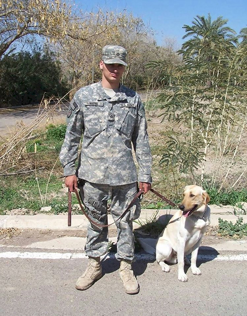 In 2007, on their first tour in Iraq, Lucca and SSgt Willingham joined up with a yellow Labrador named Cooper and her handler, Army Cpl Kory Wiens of the 94th Mine Dog Detachment, 5th Engineer Batallion, 1st Engineer Brigade. Between patrols, Lucca and Cooper snoozed together in shady patches or cavorted with a deflated football that Wiens had brought from home. Cooper and Lucca’s friendship “traveled up the leash” to their handlers. Cooper and 20-year-old Cpl Wiens were on patrol on 6 July 2007 when an insurgent remotely detonated an IED hidden in a haystack, killing both instantly. They were the first handler-dog team killed during the War on Terror; their ashes were buried together.