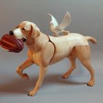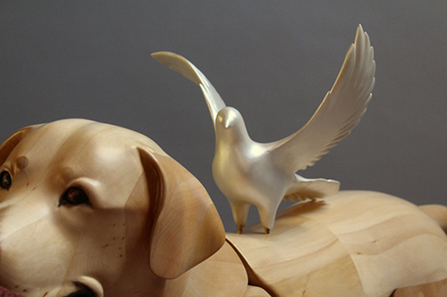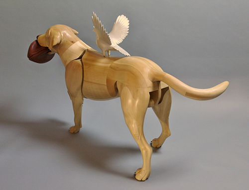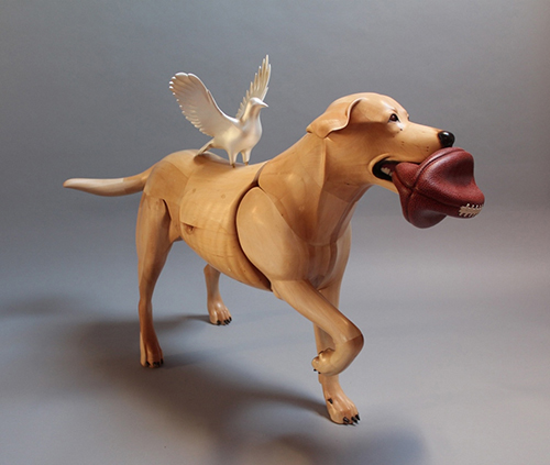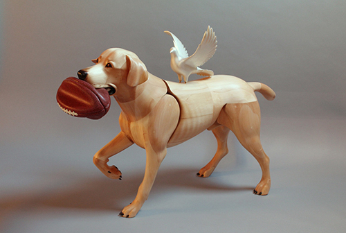 Lucca K458 is laminated and carved basswood that has been bleached, stained, and burned for coloring. Tongue is carved cherry and teeth are maple. The medallion replica of the Dickin Medal is 3D-printed.Cooper K154 is laminated and carved basswood. Dove and football are carved and painted basswood.