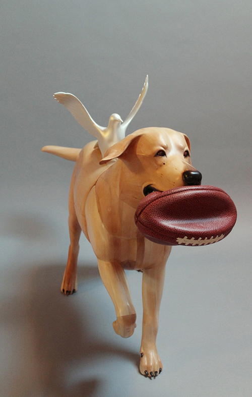 I could not imagine a better way to represent this relationship than by putting form to the rapturous and gleeful moment when Cooper greets Lucca “across the rainbow bridge.” The dove on Cooper’s back signifies the angel wings he earned. The football is Cooper’s connection on Earth to Lucca. It celebrates the dogs’ playfulness and camaraderie, which brought joy to warfighters who existed in a pit of danger, facing peril every day.