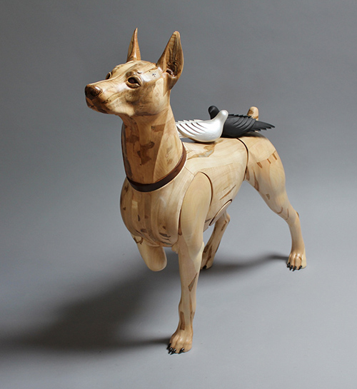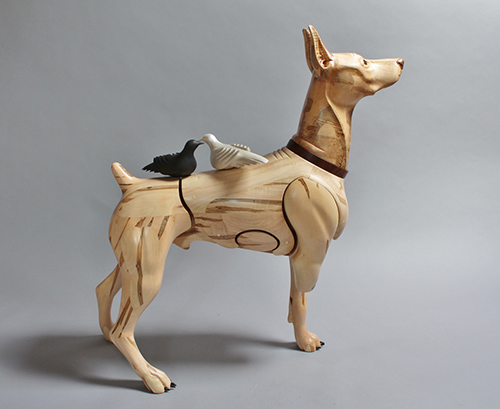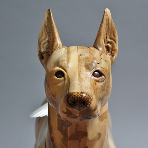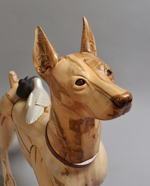 This harlequin colored Doberman, the last in the series of the Wounded Warrior Dogs Project, represents veterans of all wars that experience Post-Traumatic Stress Disorder (PTSD), formerly known as Battle Fatigue, Shell Shock and Post-Vietnam Syndrome. The doves on the back represent the stand-off of “light” and “dark” spirits when it comes to good and bad memories.