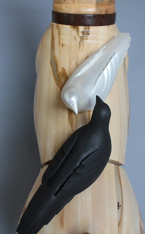 Laminated and carved ambrosia maple, walnut, copper, acrylic paint.