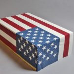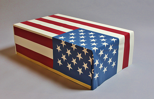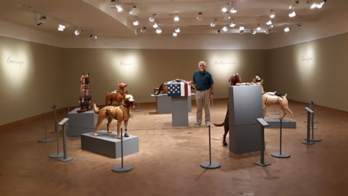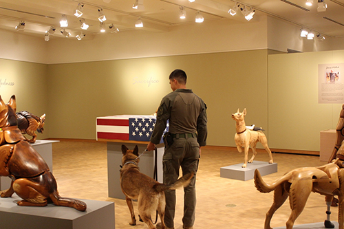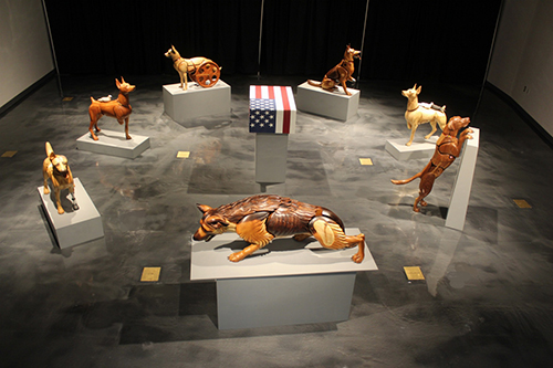 The content of this sculpture is the unseen dog, which visitors believe to be in the box under the flag. It was inspired by a video image of a handler’s flag-draped casket being unloaded from an aircraft, followed by a plain box containing the remains of his military working dog. Soldier and best friend had died together. This seventh sculpture in the installation represents the veteran who did not survive.