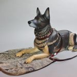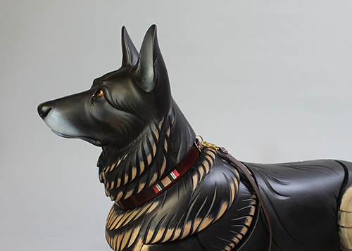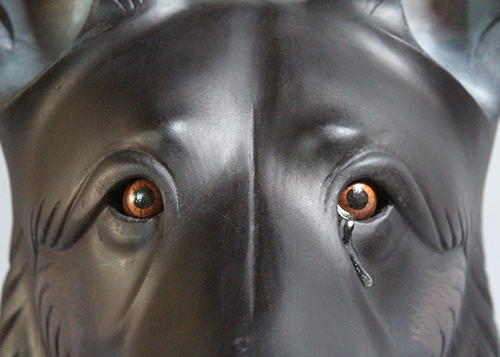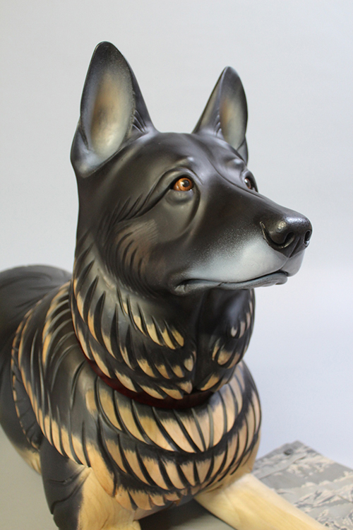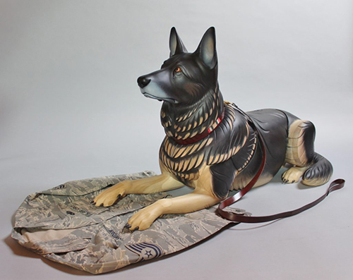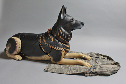 Robson, a German Shepherd also known as Robbie, served the US Air Force for six years as a Patrol and Explosive Detection Dog. Alongside his handler, Technical Sergeant David M. Simpson, he deployed to Iraq for seven months in support of Operation Iraqi Freedom and Operation New Dawn to perform explosive detection and random anti-terrorism duties. While deployed, Robbie protected the lives of coalition forces by locating weapons caches and Improvised Explosive Device materials; the pair also patrolled Iraqi polling locations to ensure citizens had a safe place to vote. While at their home station, Robbie protected DoD assets and base personnel, providing explosive detection for multiple distinguished visitor visits including the United States President and Vice President. When Robbie retired from military service in 2014 he reunited with his combat partner. For the next three years Robbie served as TSgt Simpson’s service dog, beloved family member, and devoted partner. Sadly, TSgt Simpson took his own life after becoming overwhelmed by paranoia exacerbated by post-traumatic stress disorder and severe pain from Lyme disease contracted in the field. The sculpture depicts Robson waiting for TSgt Simpson. He is looking up and off into the distance, but there is no one on the other end of the leash.